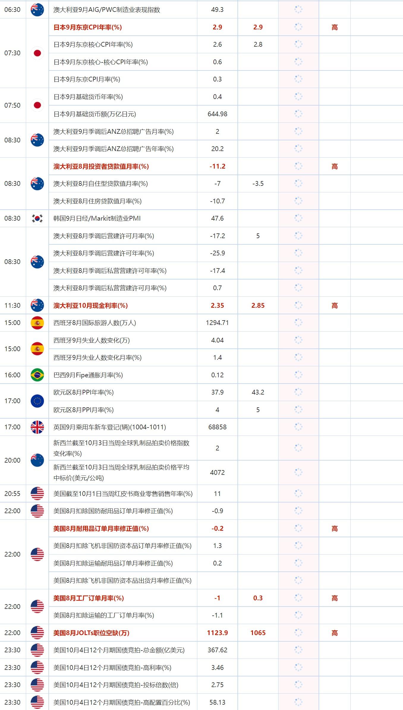 11:30 澳大利亚10月现金利率(%) , 前值 2.35 , 预期值 2.85 , 公布值:待发布15:00 西班牙8月国际旅游人数(万人) , 前值 1294.71 , 预期值 -- , 公布值:待发布