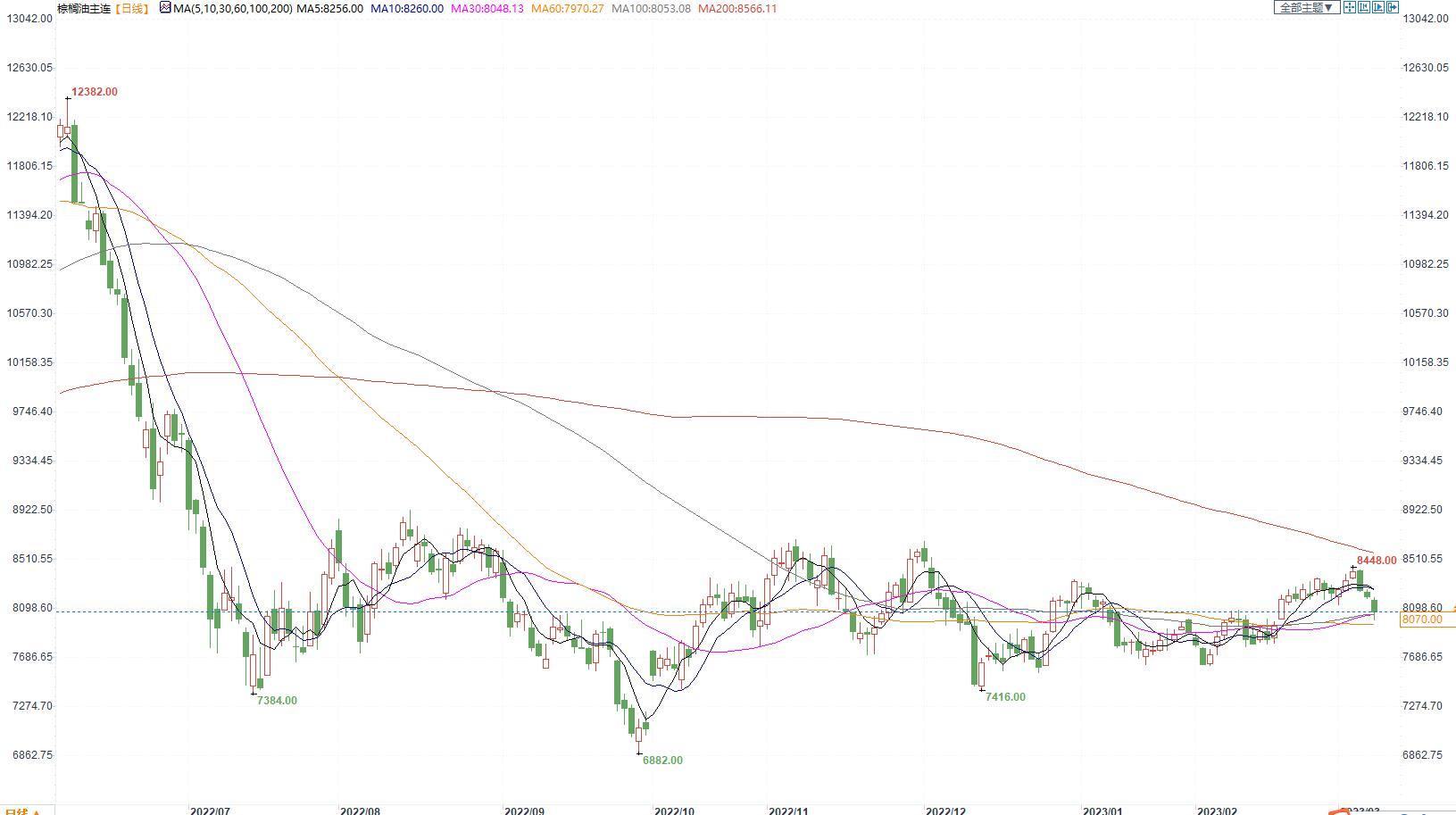 棕榈油2305合约日内跌1.85%,收盘8070元/吨,广州市场棕榈油8090元/吨。