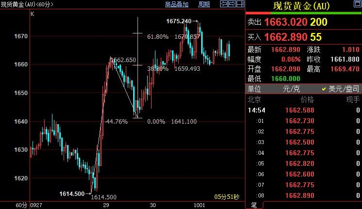 现货黄金上浮0.22%至1665.74美元/盎司;COMEX期金主力合约上涨0.11%至1673.8美元/盎司;