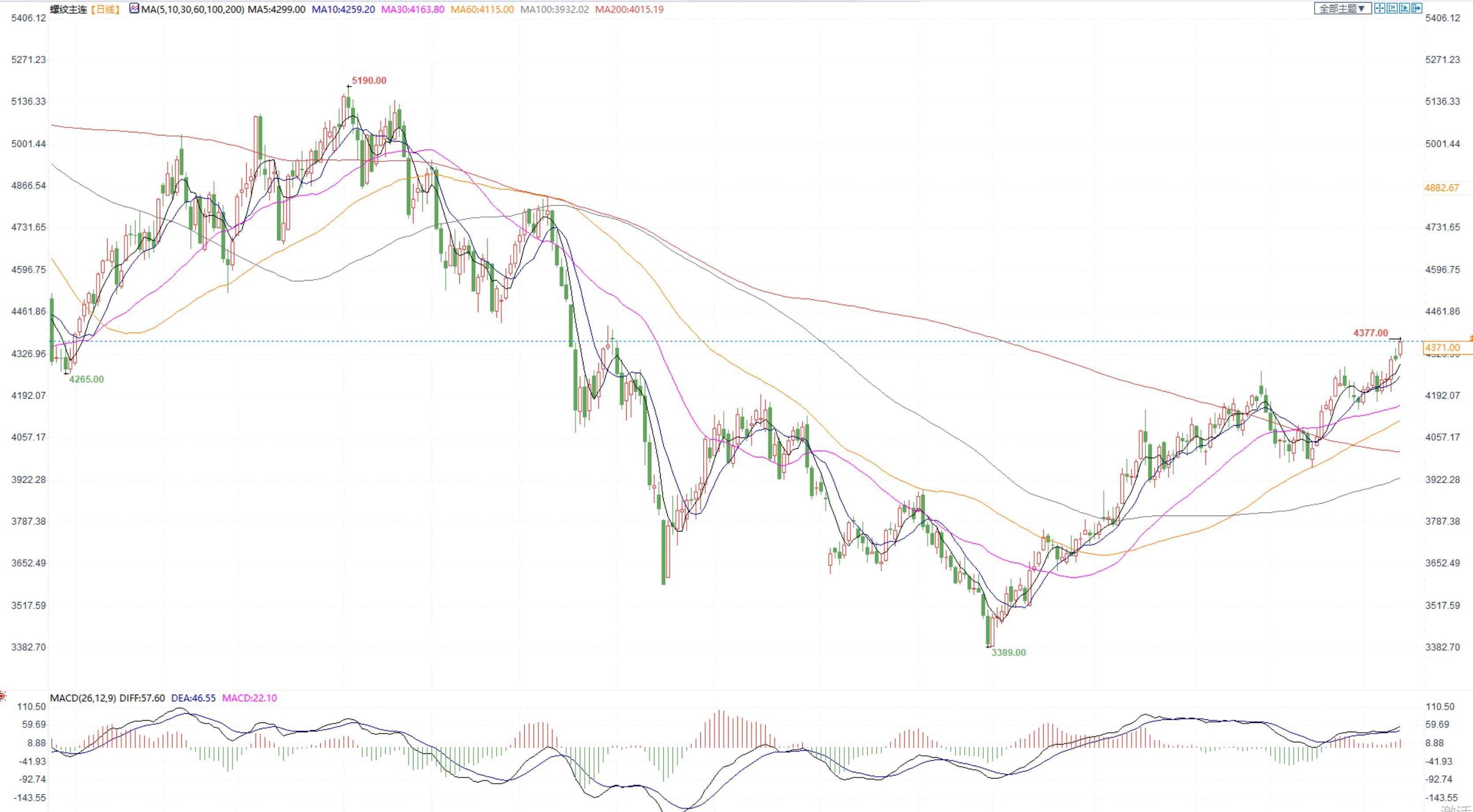 价格:今日黑色系整体偏强运行。螺纹钢2305合约今日继续上行,再次创新高4377,日K收阳线。收盘价4371元/吨,收涨0.99%。今日现货价也出现明显回升,上海中天现货价4390元/吨,环比增50元/吨。