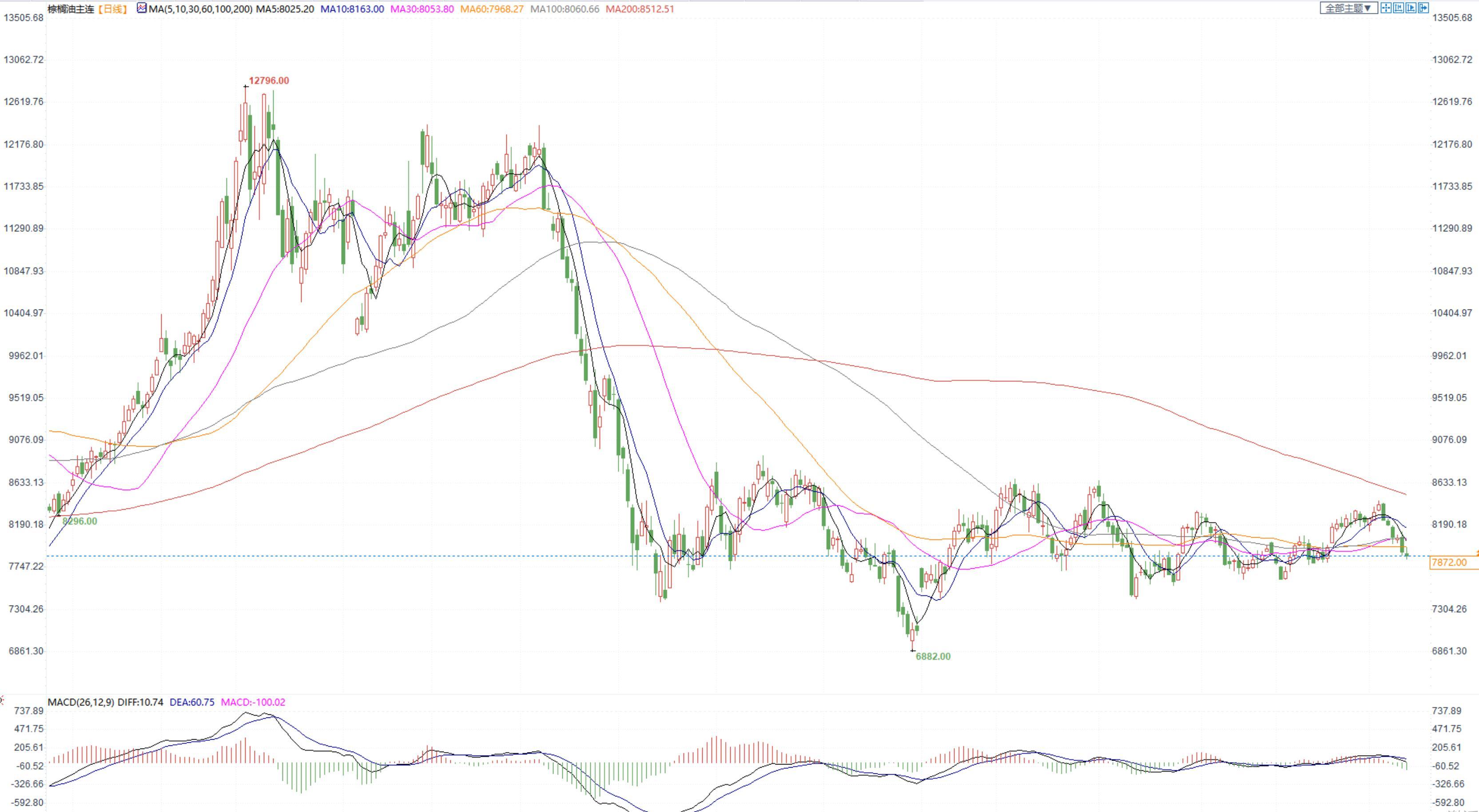 棕榈油2305合约日内跌1.45%,收盘7872元/吨,广州市场棕榈油7940元/吨。