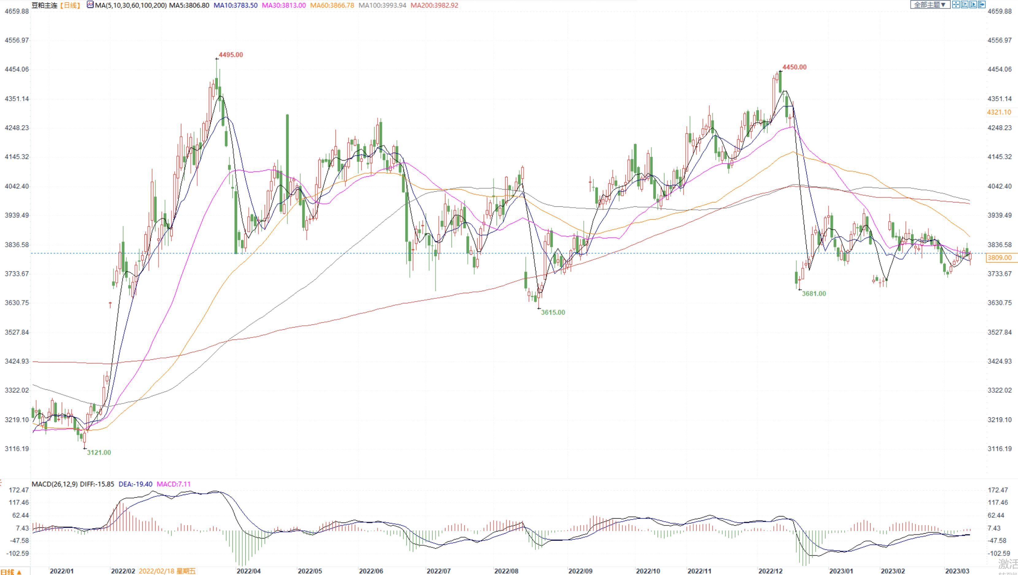 豆粕2305合约日内跌0.26%,收盘价3809元/吨,张家港市场豆粕4135元/吨。