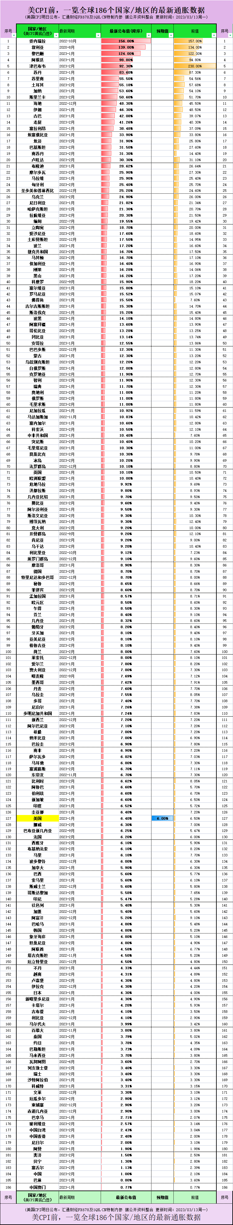 汇通财经APP讯——美国硅谷银行破产风暴、市场流动性危机的担忧升温之际,周二(3月14日)将出炉的美国2月通胀报告,愈发备受关注。而且下周就迎来美联储决议,市场热议这三者对金融市场的影响。本文一方面整理了全球186个国家地区的最新通胀数据排行榜(见下图1),同时也汇总了一些著名投行机构及经济学家的对此三者的看法观点。