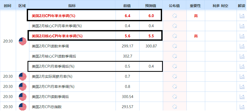 美国2月CPI年率预期上升6.0%,1月CPI年率6.5%;2月核心CPI年率预期上升5.5%,1月上升5.6%。更多见下汇通财经日历截图(图2),其中大黑框三个是重点: