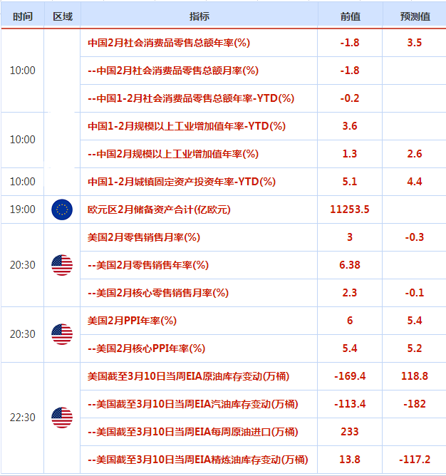 本交易日需要重点关注美国2月份零售销售月率,该数据俗称“恐怖数据”,投资者需要重点关注。