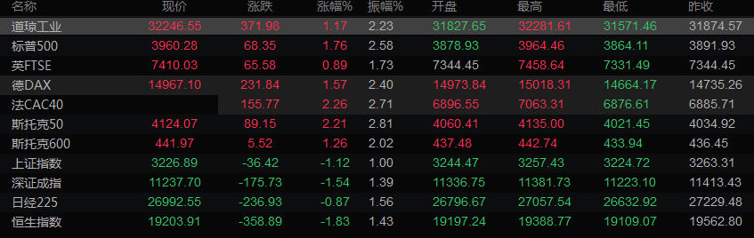 美股收盘情况:道琼斯工业指数上涨1.17%,至32246.55点;