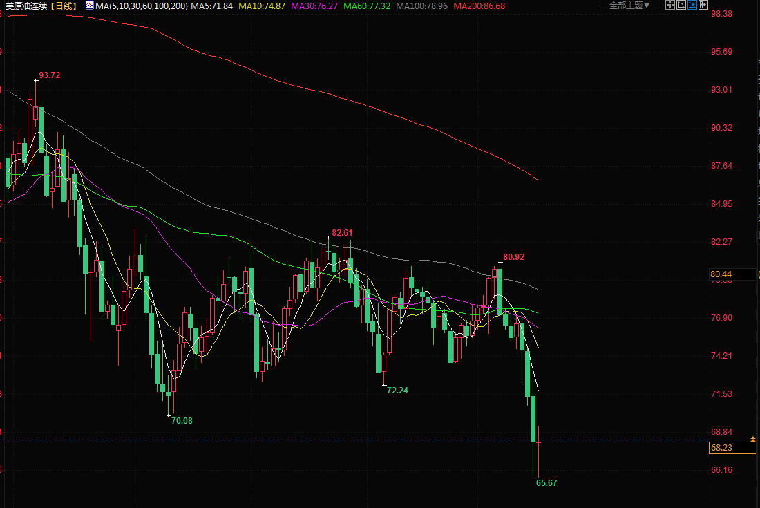 周四稍早,两大指标下跌超过1美元,接近15个月最低。周三,美国原油自2021年12月20日以来首次跌破每桶70美元。