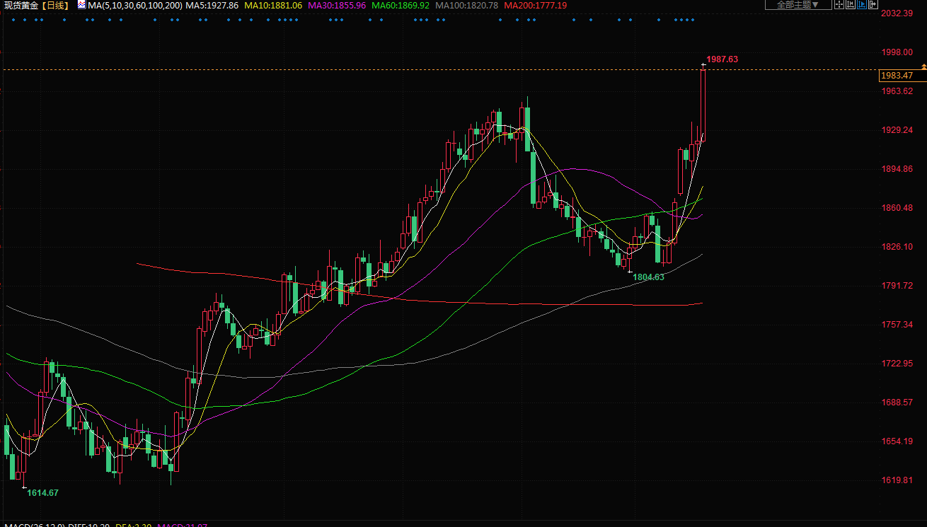 金价周五大涨超过2%,且创下三年来最大周线涨幅,一轮银行业危机震撼全球市场,且对美联储将在对抗通胀方面不那么激进的押注也得到巩固。现货金攀升2.8%,至每盎司1971.95美元,为2022年4月以来最高。本周现货金已经上涨约5.6%,为2020年3月以来最大周线涨幅。
