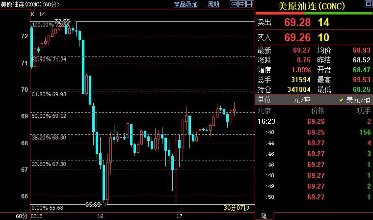 小时图上看,油价升破68.31美元,短线或进一步反弹至69.93美元和71.24美元,它们分别是72.55-65.69美元下行区间的50%、61.8%和80.90%斐波那契回档位。