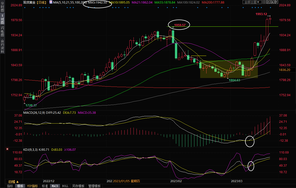 单边上涨;均线多头排列,MACD金叉,KDJ金叉,布林线开口,金价上周五顶破了2月2日高点1960关口附近强阻力,在失守该位置前,后市偏向多头,初步阻力在日内高点1993.12附近,进一步阻力在2000整数关口附近,2022年3月10日高点阻力在2009.10附近,2020年8月18日高点阻力在2015.59附近,2015-2075之间并无明显阻力存在,届时需要留意金价快速拉升的可能性,留意个整数关口的阻力情况。