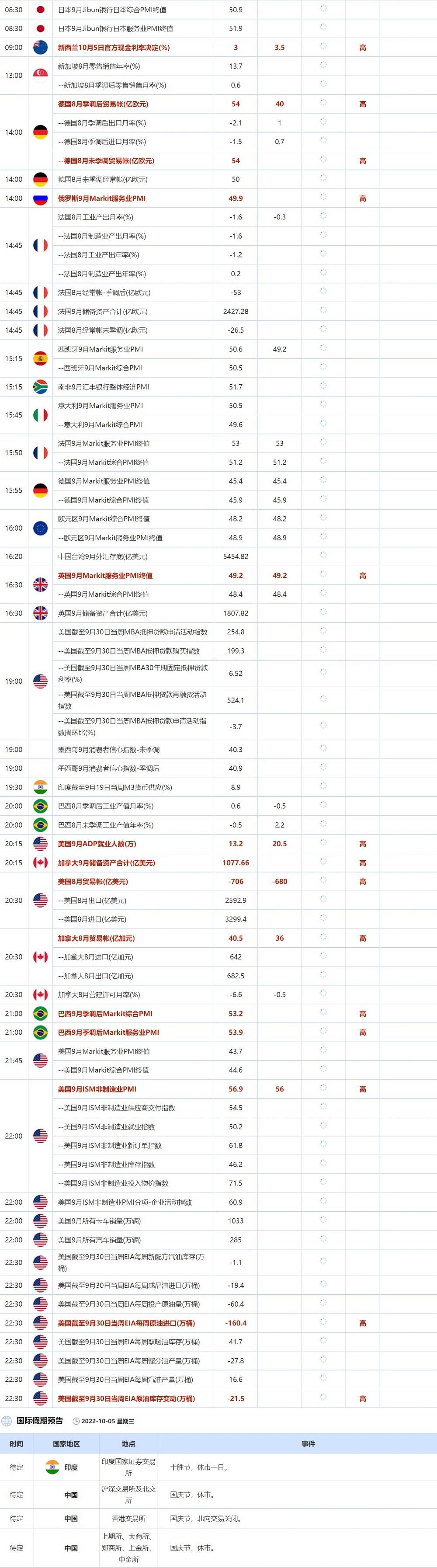 2022年10月5日,全球主要经济体将公布经济数据,需重点关注德国8月季调后贸易帐,美国9月ADP就业人数,美国8月贸易帐,加拿大8月贸易帐,美国9月ISM非制造业PMI,美国截至9月30日当周EIA原油库存变动。大事方面需关注: 新西兰联储利率决议,OPEC+会议,英国首相特拉斯在保守党年度闭门大会上发表讲话。