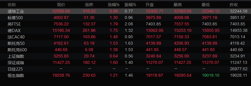 标普500指数上涨1.30%,至4002.87点;纳斯达克指数上涨1.58%,至11860.11点。