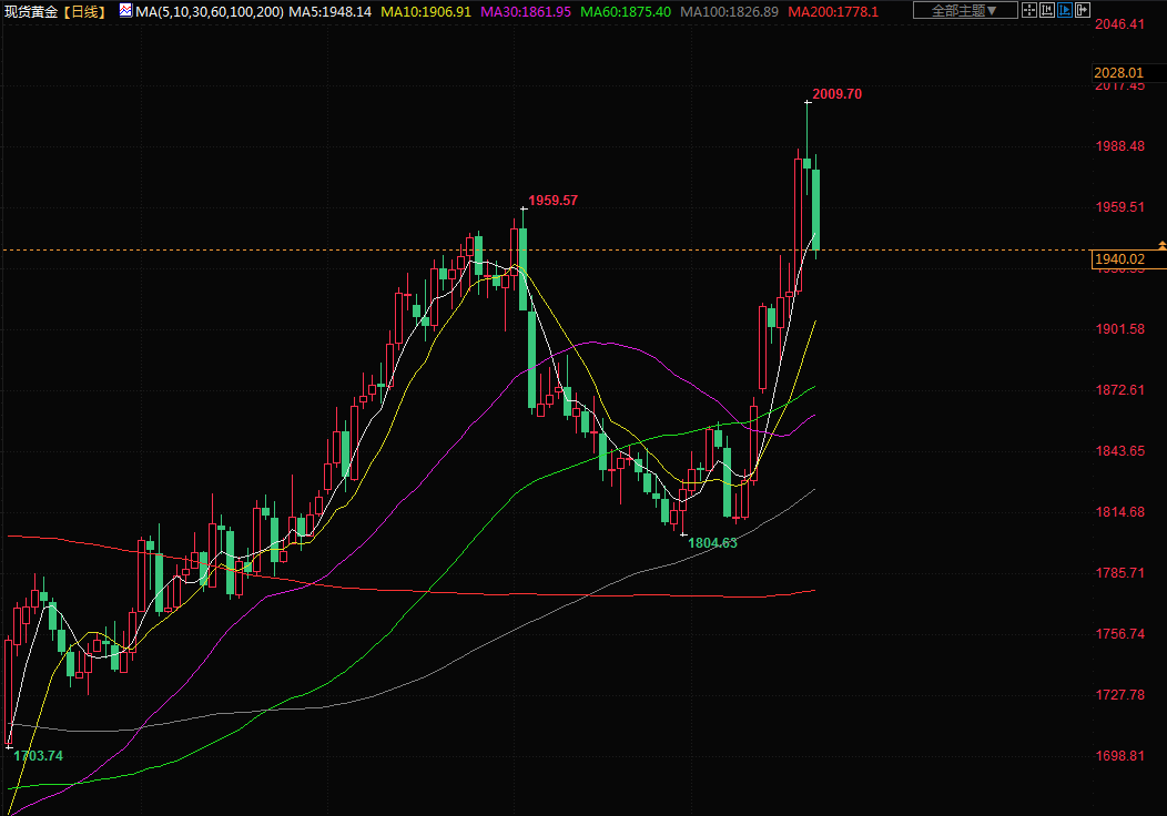 金价周一触及2009.59美元的2022年3月以来最高,但此后有所回落。Kitco Metals高级分析师Jim Wyckoff表示:“我们看到今天市场上的避险情绪有所减弱......但主要是在昨天金价触及12个月高位后,短期期货交易商大量获利了结。”