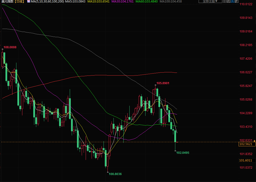 美元指数尾盘下跌0.63%,至102.500,欧元上涨0.87%,至1.0861美元。