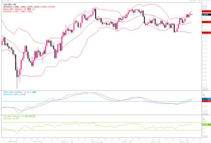 上涨0.13%,至1.2284。 英国央行周四将利率再提高25个基点至4.25%,并保持其指引不变,即货币政策委员会认为继续快速加息的紧迫性不大。英国央行决策者对该国的经济前景更加乐观。在九位政策制定委员会委员中,七位赞成加息25个基点,两位反对。虽然英央行继续加息25个基点,但鉴于通胀将开始降温的预期,英国央行似乎仍热衷于暂停加息。因此加息消息并未能出现刺激英镑飙升的行情出现。日线图上,