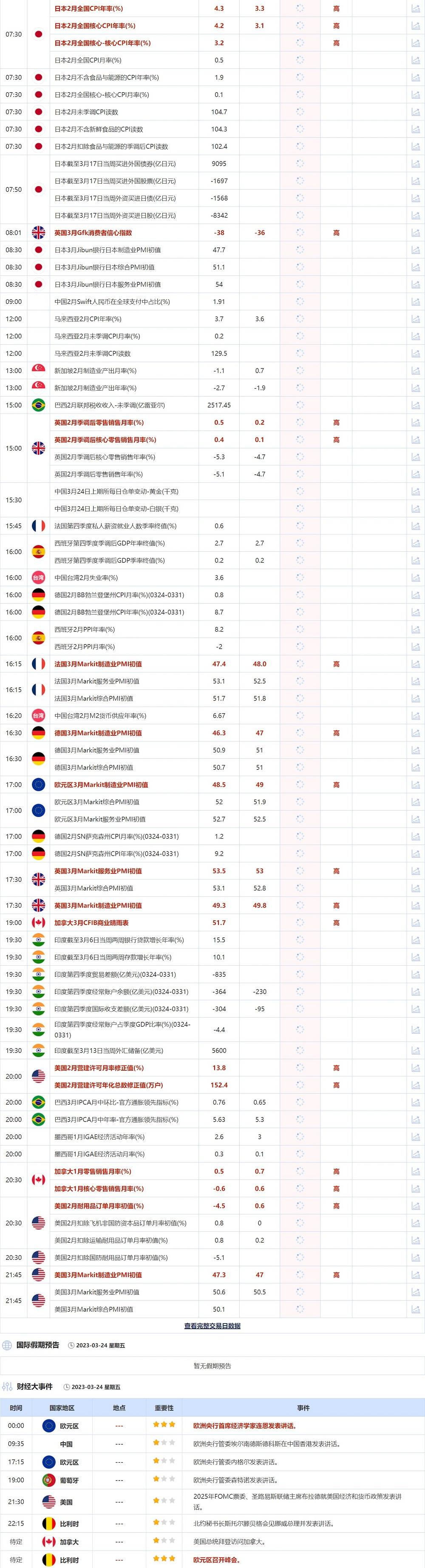 07:30 日本2月全国核心CPI年率(%) , 前值 4.2 , 预期值 3.1 , 公布值:待发布07:30 日本2月全国核心-核心CPI年率(%) , 前值 3.2 , 预期值 -- , 公布值:待发布07:30 日本2月全国CPI月率(%) , 前值 0.5 , 预期值 -- , 公布值:待发布