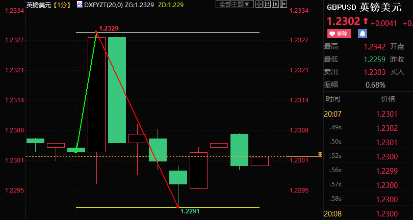英镑兑美元波动38个点,高点和低点分别为1.2329和1.2291。