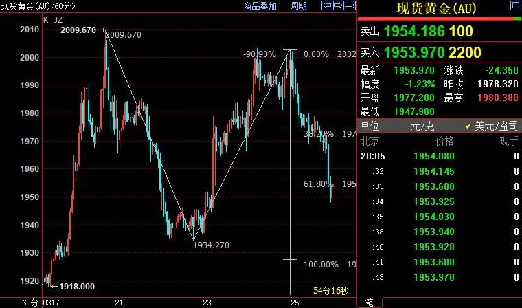 现货黄金下跌1.20%至1955.12美元/盎司;COMEX期金主力合约下跌1.39%至1956.2美元/盎司;