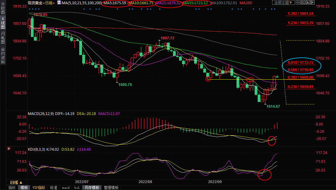 单边下跌后反弹;MACD金叉,KDJ金叉,5日均线上穿10日均线结成金叉,金价顶破了21日均线和1680关口的双重阻力,也初步顶破了9月21日高点和9月1日低点1688.71附近的双重阻力位,目前该位置已经转化为初步支撑所在,在失守该位置前,金价后市偏向延续反弹走势,进一步阻力参考1807-1614跌势的50%回撤位1710.89附近阻力,关键阻力在55日均线1723.13附近,61.8%回撤位阻力在1733.72附近。