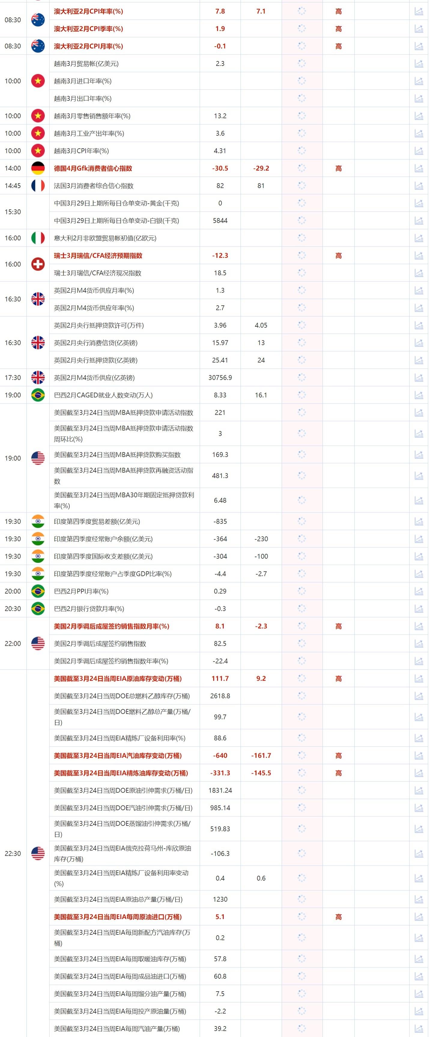 08:30 澳大利亚2月CPI季率(%) , 前值 1.9 , 预期值 -- , 公布值:待发布08:30 澳大利亚2月CPI月率(%) , 前值 -0.1 , 预期值 -- , 公布值:待发布10:00 越南3月贸易帐(亿美元) , 前值 2.3 , 预期值 -- , 公布值:待发布
