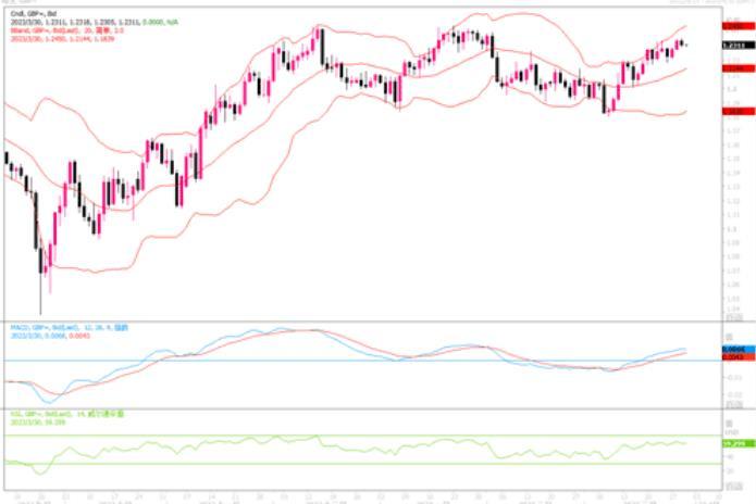 盘中曾最高至1.2362水平,为2月2日以来最高。英国央行总裁贝利周二表示,在全球银行业动荡的情况下,央行处于警戒状态,但他补充说,英国没有经历与SVB和瑞士信贷的问题相关的压力。对全球金融体系健康状况的担忧继续缓解,也刺激了对风险敏感的英镑抬升。日线图上,目前镑美仍能保持在各短期均线上方,技术指标处于均衡线略上方,汇价也还完整地保持在近期形成的上升通道内。因此存在继续试高的可能性,上方首要冲击的高点就是年初到达过的1.2448水平。下方初步较为坚实的支撑在1.22附近。