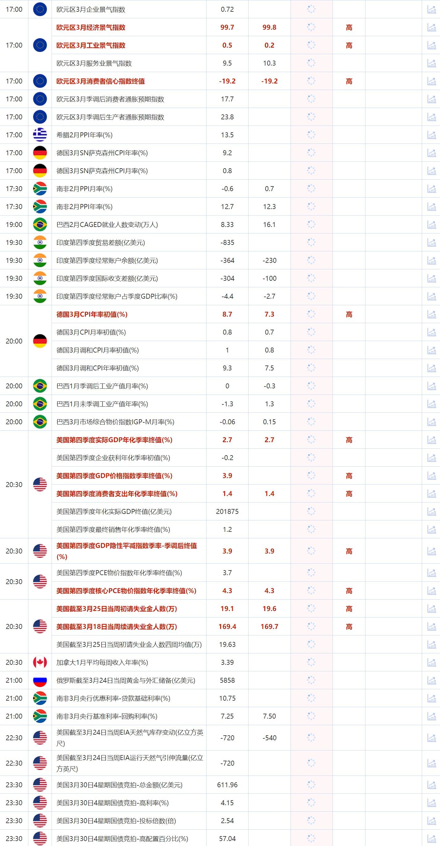 17:00 欧元区3月消费者信心指数终值 , 前值 -19.2 , 预期值 -19.2 , 公布值:待发布17:00 欧元区3月季调后消费者通胀预期指数 , 前值 17.7 , 预期值 -- , 公布值:待发布