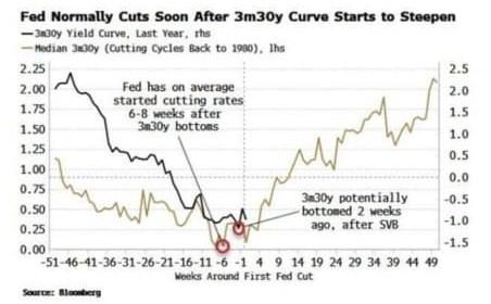 (左边红圈表示,美联储平均在3个月期30年期触底之后6到8周开始降息;右边红圈表示,硅谷银行事件之后,两周前,3个月期30年期可能触底)