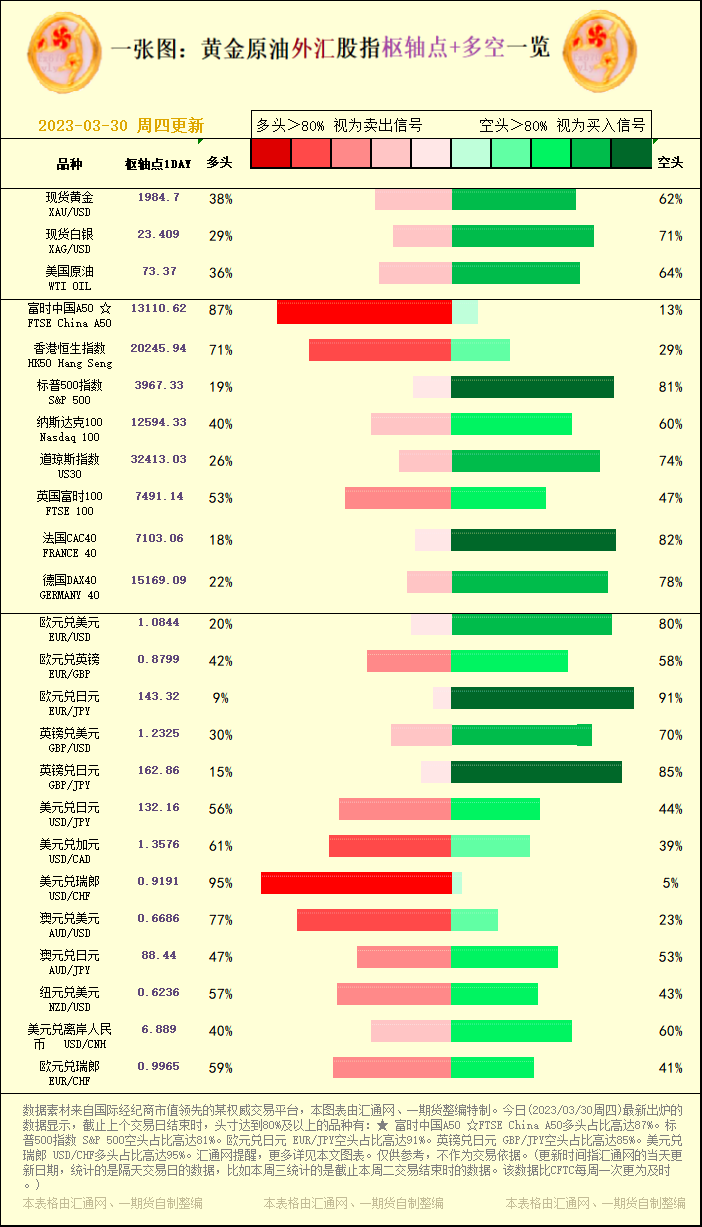 一张图:黄金原油外汇股指"枢纽点+多空占比"一览(2023/03/30周四)