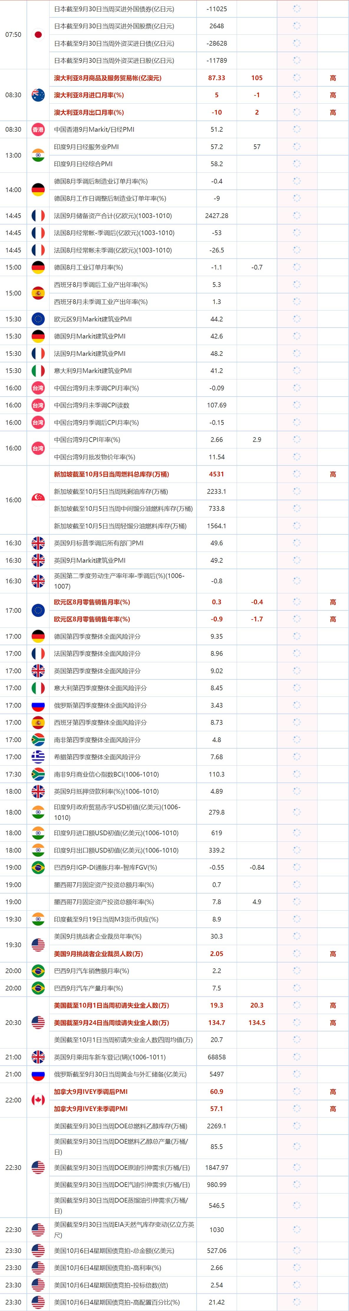 08:30 澳大利亚8月出口月率(%) , 前值 -10 , 预期值 2 , 公布值:待发布08:30 中国香港9月Markit/日经PMI , 前值 51.2 , 预期值 -- , 公布值:待发布