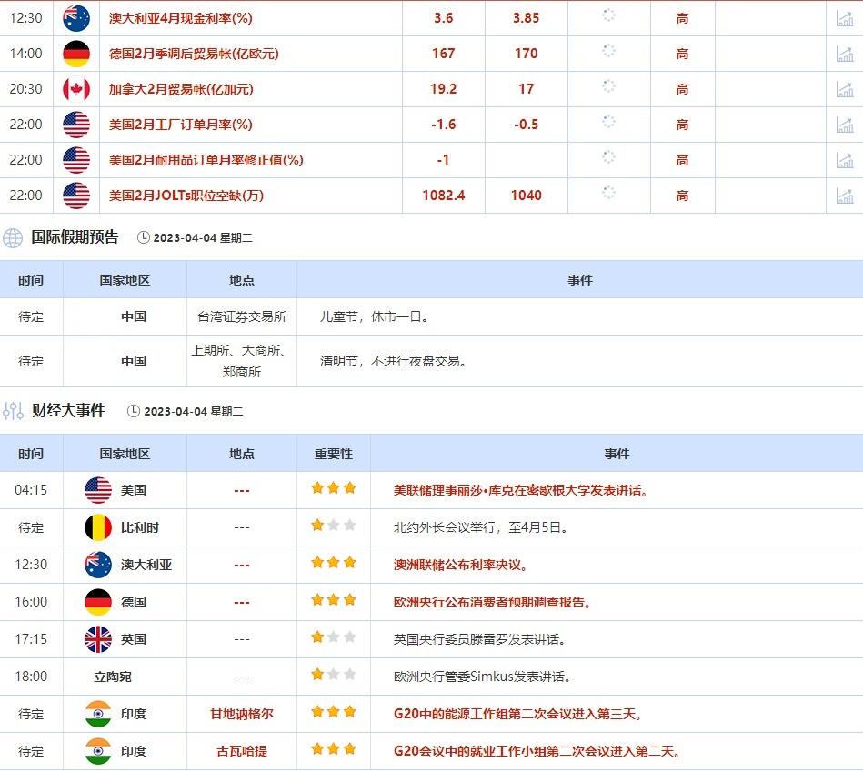 ②虽然澳大利亚官方季度通胀数据将于4月底公布,但鉴于连续两个月走软的月度通胀指标,相信澳洲联储明天将选择暂停加息,并在下个月重新评估通胀情况。然而,即使澳洲联储在4月暂停加息,仍预计澳洲联储主席洛威的声明将保持鹰派倾向