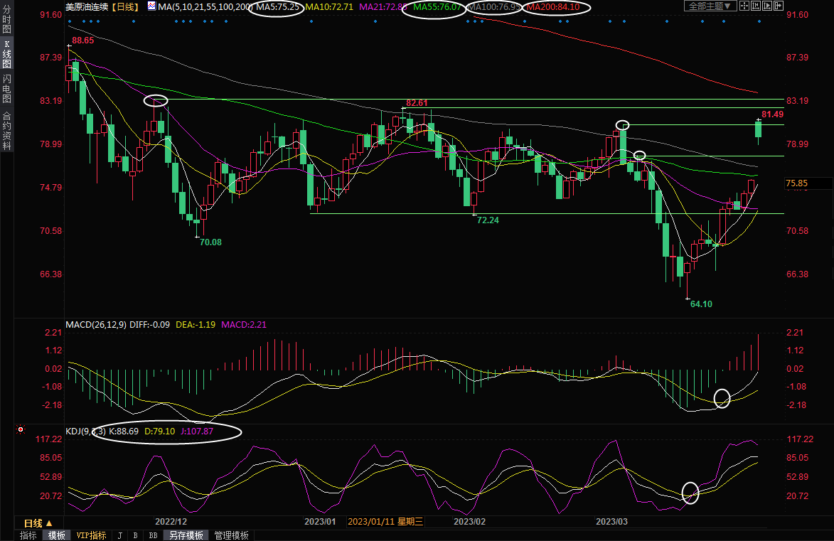 V型反转;MACD金叉,KDJ金叉,油价基本完成了V型反转,目前遭遇前期震荡箱体顶部区间附近阻力压制,油价倾向于震荡一段时间后延续涨势,初步阻力在3月7日高点80.92附近,日内高点在81.49附近,1月23日高点阻力在82.61附近,12月1日高点阻力在83.31附近,200日均线阻力在84.10附近,这是油价短线有望触及的位置,如果进一步上破, 则增加中线看涨信号。