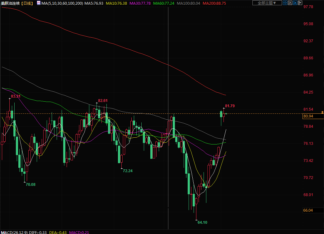 美原油交投于80.95美元/桶附近;油价周二涨幅受限,因投资者将OPEC+的减产计划与美国疲软的经济数据进行了权衡,这些数据可能显示石油需求降温;早间API数据显示美国原油库存下降,日内关注晚间EIA数据。