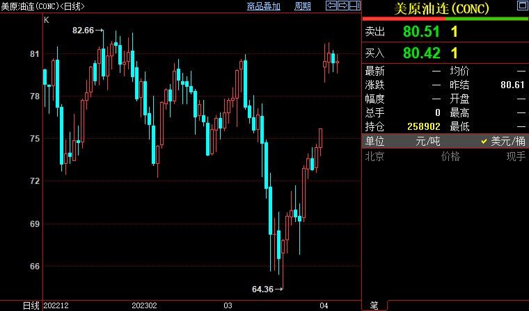 布伦特原油期货分别收于80.46美元桶和84.94美元/桶。因石油输出国组织及其合作伙伴(OPEC+)决定进一步减产、美国库存下降以及沙特出口再提价,尽管市场对全球经济前景的担忧限制了油价涨势。