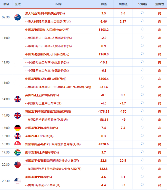 周四(4月13日)关键词:中国贸易帐、美国PPI数据、初请数据