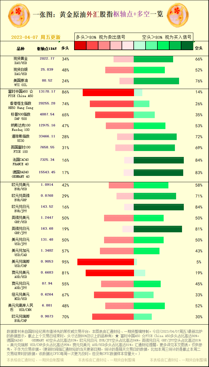 标题:一张图:黄金原油外汇股指"枢纽点+多空占比"一览(2023/04/07周五)