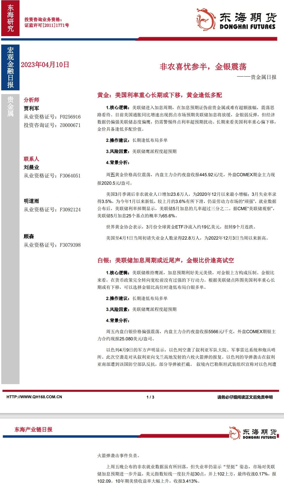 标题:【东海期货4月10日产业链日报】贵金属篇:非农喜忧参半,金银震荡