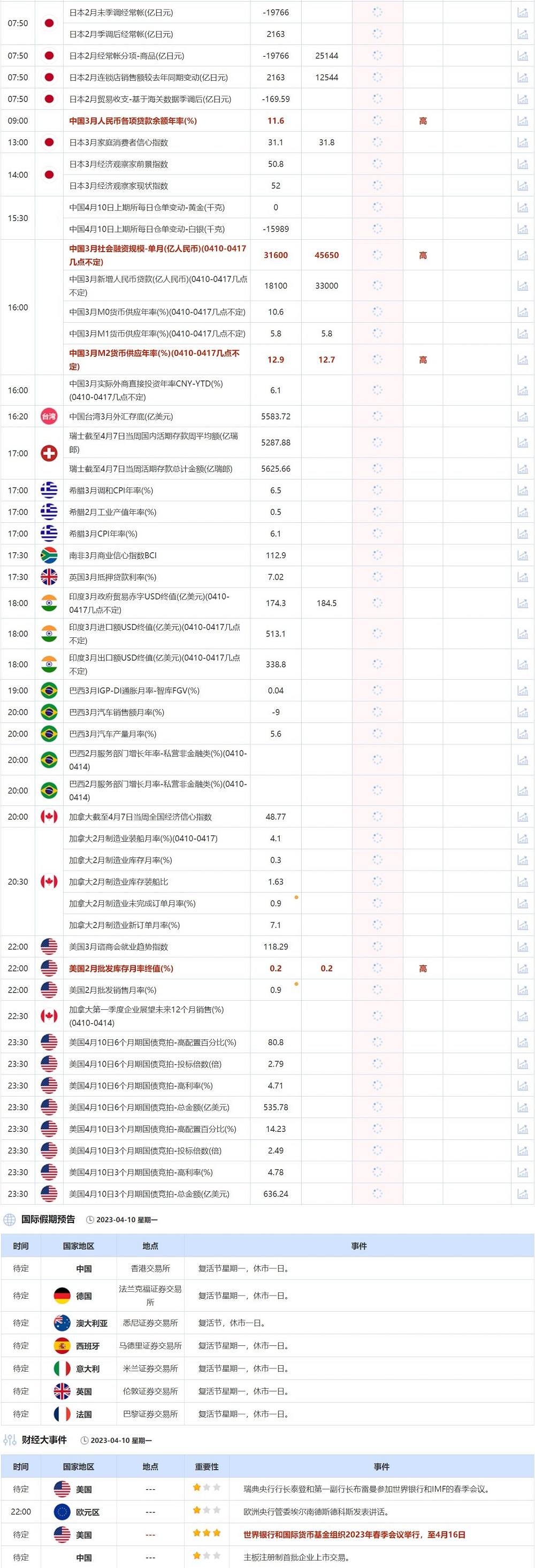 汇通财经APP讯——4月10日,投资者需要关注的重点数据:中国3月人民币各项贷款余额年率,中国3月社会融资规模-单月,中国3月M2货币供应年率和美国2月批发库存月率终值。需要关注的大事件包括世界银行和国际货币基金组织2023年春季会议举行,至4月16日;欧洲央行管委埃尔南德斯德科斯发表讲话。此外,欧洲多国因复活节休市,也需引起投资者注意。