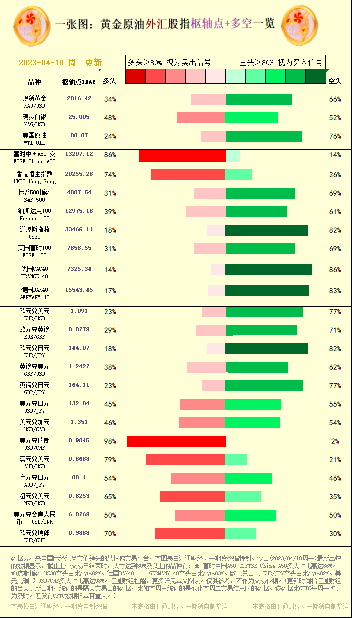 标题:一张图:黄金原油外汇股指"枢纽点+多空占比"一览(2023/04/10周一)