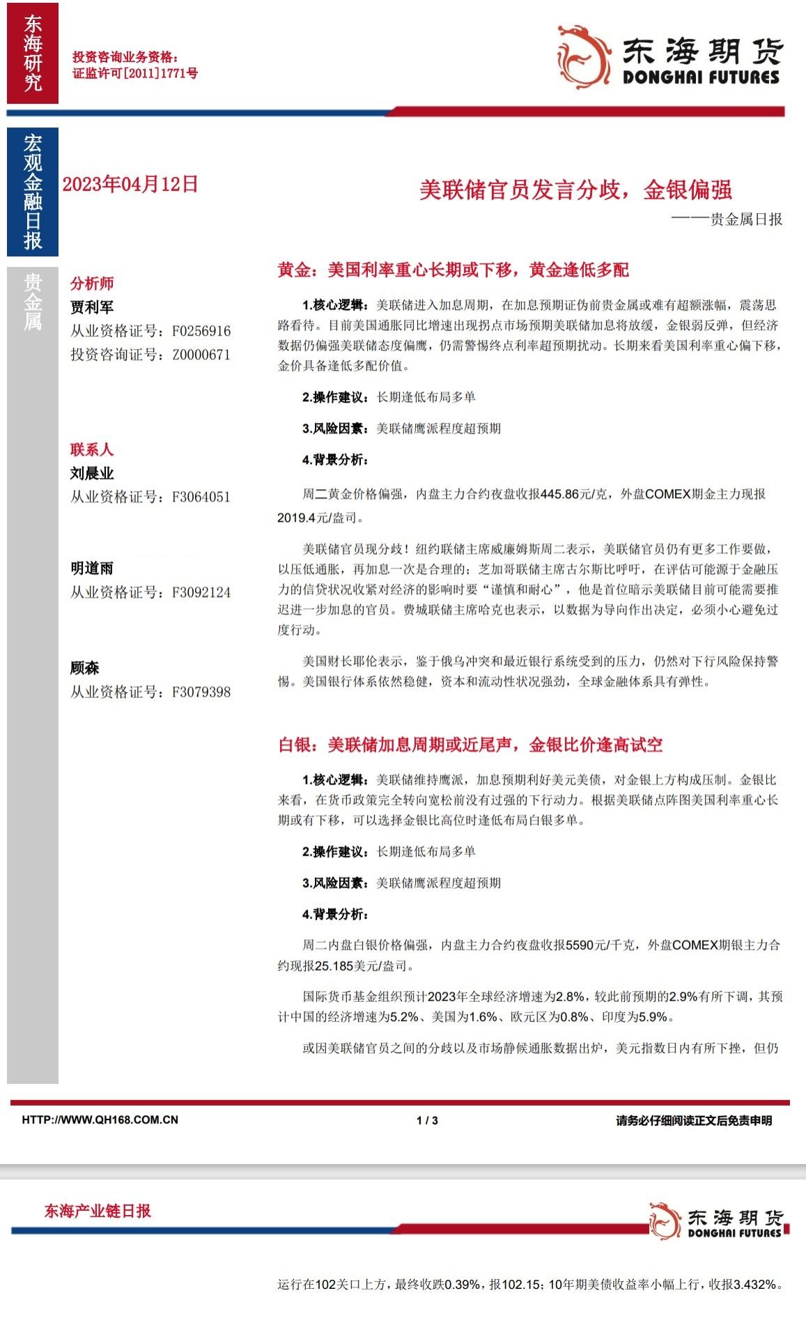 标题:【东海期货4月12日产业链日报】贵金属篇:美联储官员发言分歧,金银偏强
