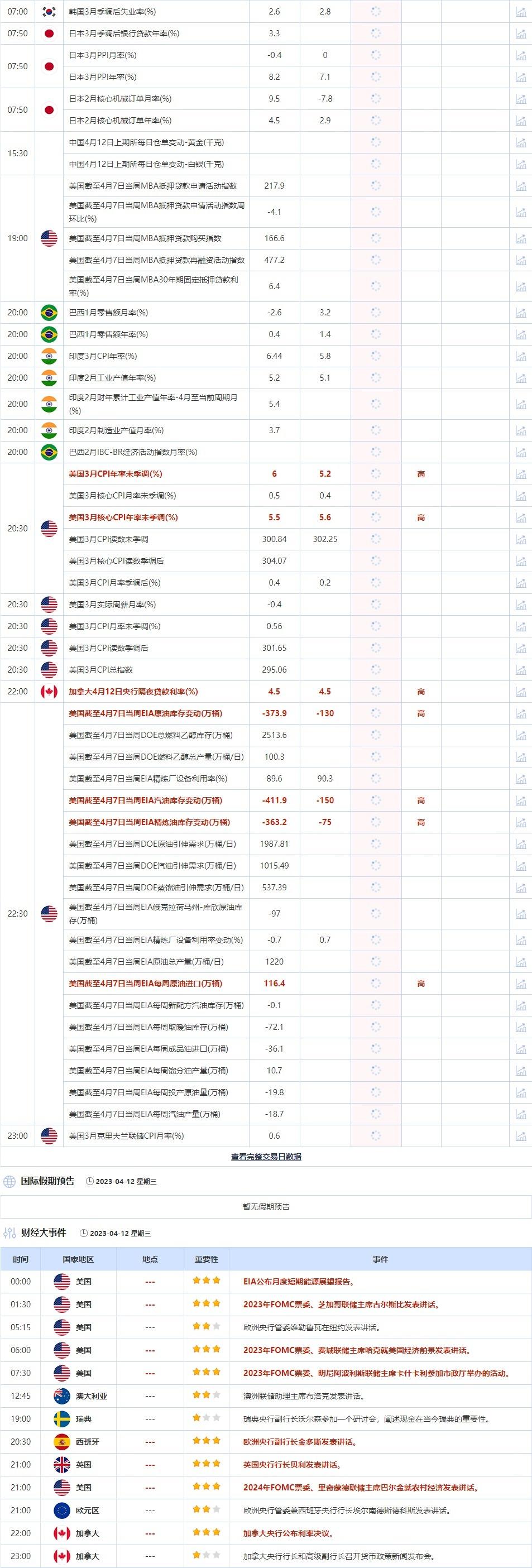 20:30 美国3月CPI年率未季调(%) , 前值 6 , 预期值 5.2 , 公布值:待发布20:30 美国3月核心CPI月率未季调(%) , 前值 0.5 , 预期值 0.4 , 公布值:待发布