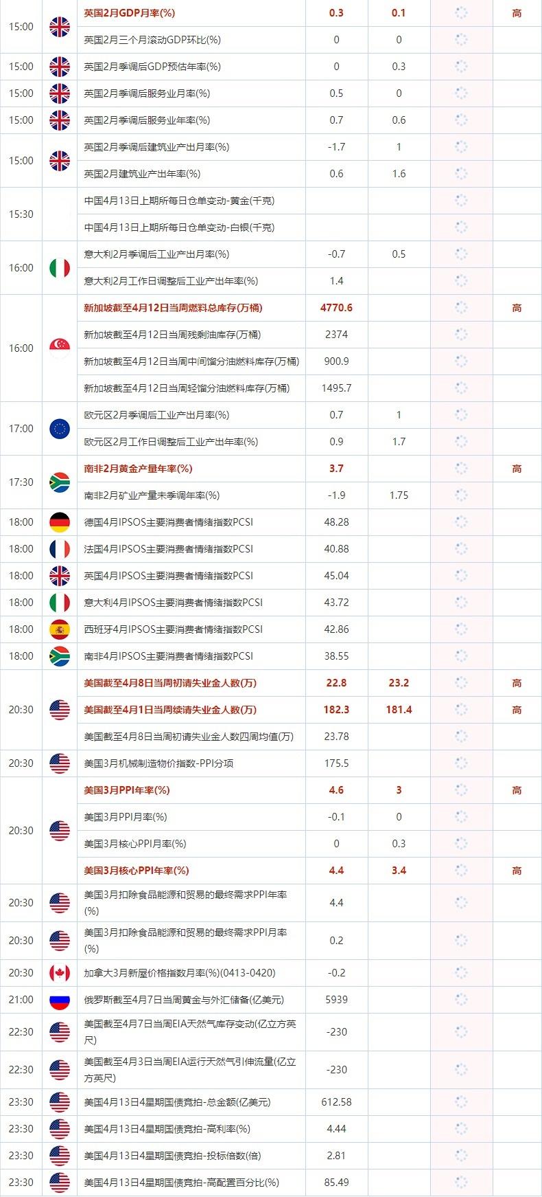 20:30 美国3月PPI年率(%) , 前值 4.6 , 预期值 3 , 公布值:待发布20:30 美国3月PPI月率(%) , 前值 -0.1 , 预期值 0 , 公布值:待发布