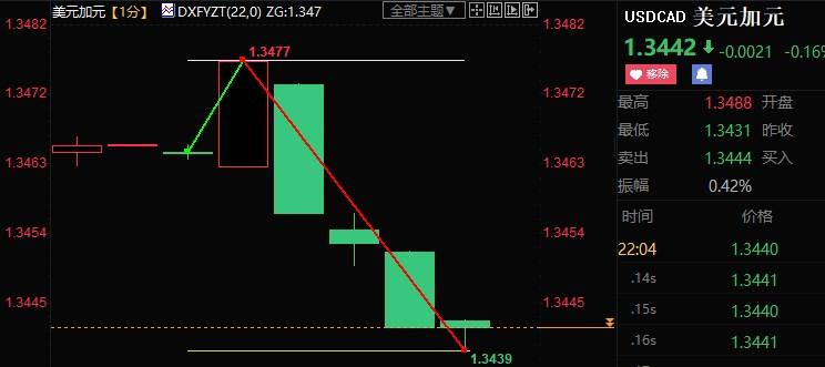 美元兑加元下跌26点至1.3439,累计波动近40点。