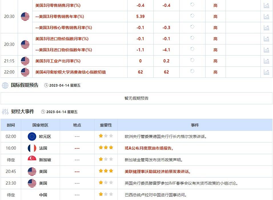 联邦基金利率期货交易员的定价是,美联储的指标利率将在6月份从现在的4.830%达到峰值5.01%,然后在12月份回落到4.34%。下一个重要的美国经济数据将是周五的零售销售,市场将分析通胀如何影响消费者支出。