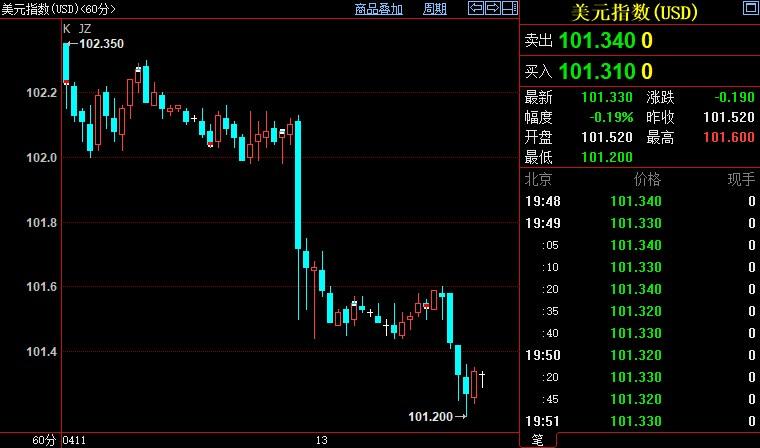 美元指数下跌0.19%至101.333,盘中创2月2日以来新低至101.201。