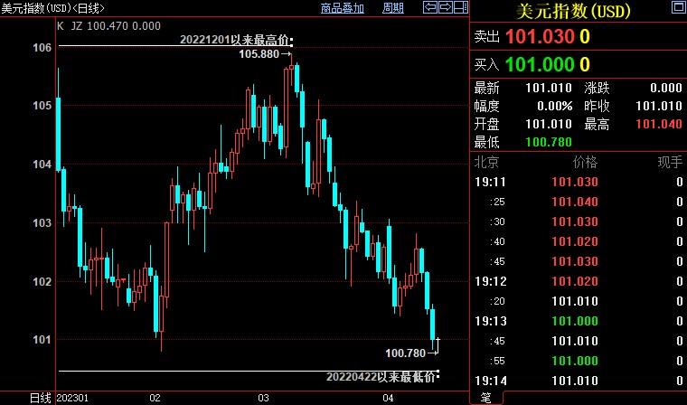 汇通财经APP讯——美元指数连续第四周下跌,刷新2022年4月下旬以来低点至100.779,并有望创下1月13日当周以来最大跌幅(逾1%),因迹象显示美国通胀可能降温之后,交易员加大对美联储加息周期即将结束的预期。