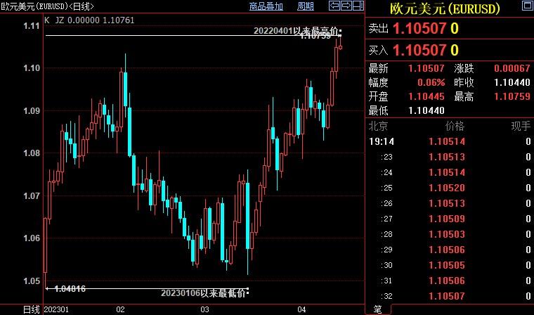 欧元兑美元四连涨,涨幅逾1.4%,创2022年4月初以来新高至1.1075。几位欧洲央行决策者认为,欧洲央行有理由进一步加息,但对需要加多少提出了不同观点。而消息人士称,尽管其他选项仍在讨论之列,决策者趋于就5月加息25个基点达成一致。