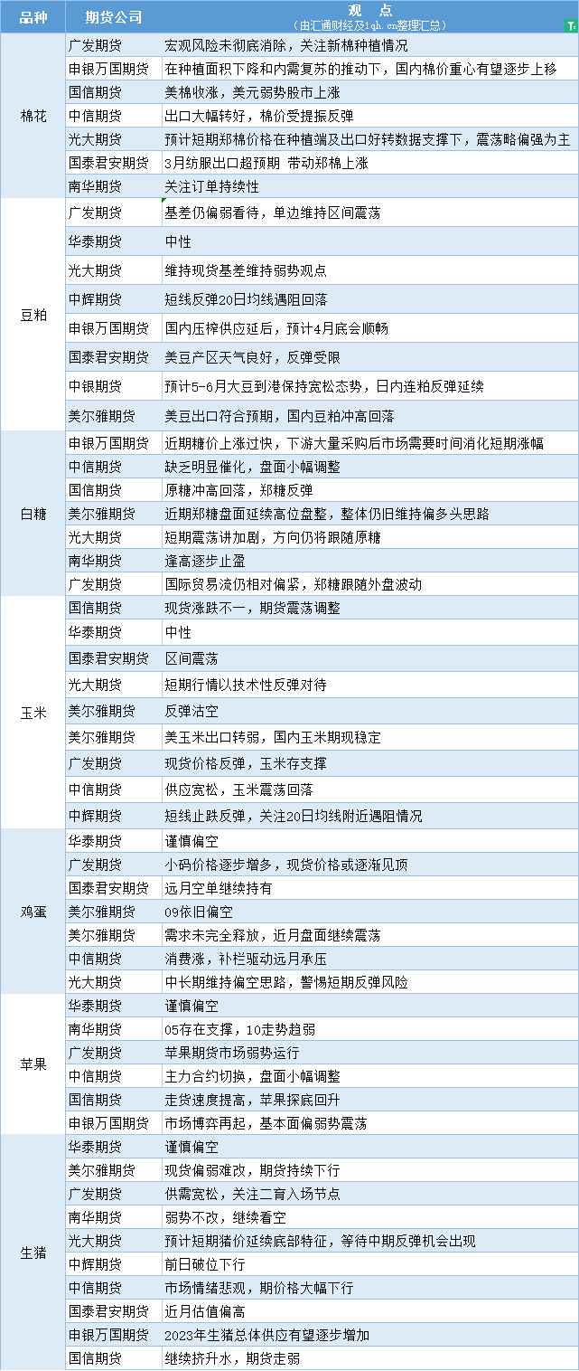 标题:期货公司观点汇总一张图:4月14日农产品(棉花、豆粕、白糖、玉米、鸡蛋、生猪等)