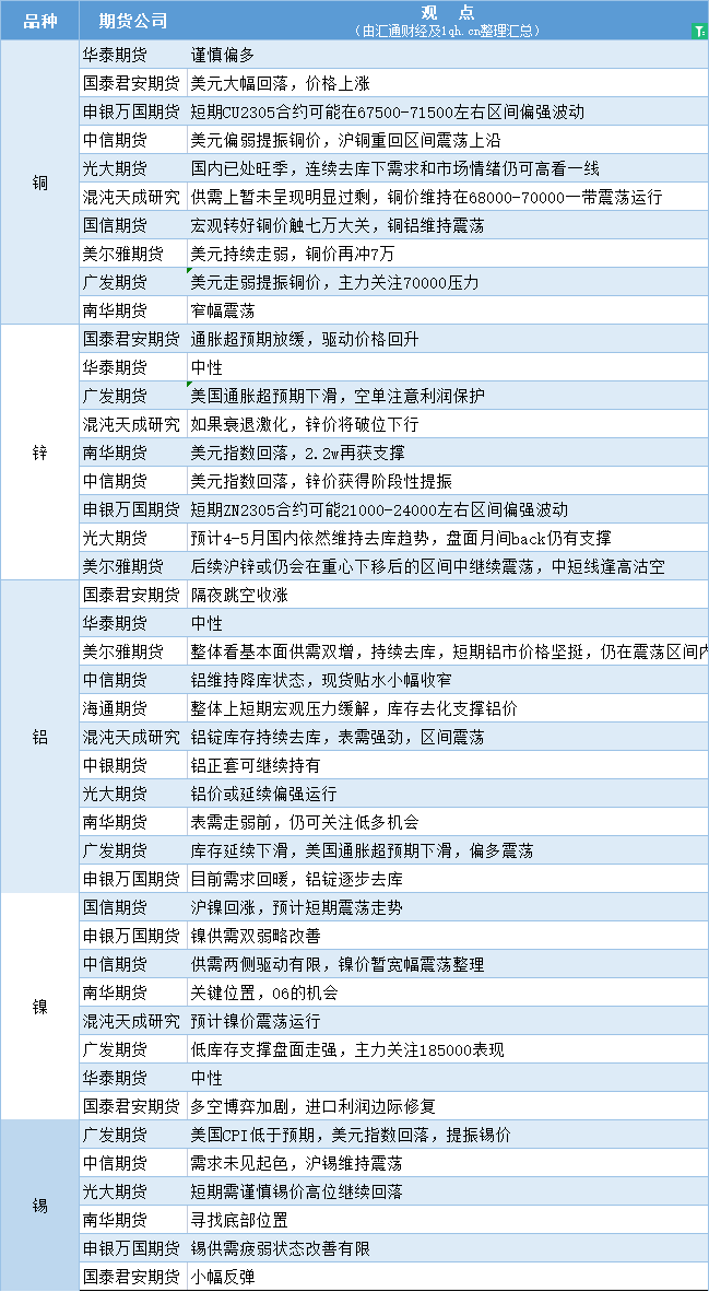 标题:期货公司观点汇总一张图:4月14日有色系(铜、锌、铝、镍、锡等)