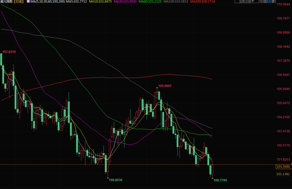 美元指数当日上涨0.57%,报101.53,此前跌至100.78,为去年4月以来最低。它仍处于连续第五周周线下跌的轨道上。