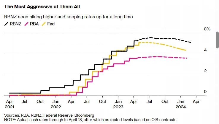 澳洲联储在加息350个基点后,4月4日暂停了为期11个月的紧缩周期。一天后,新西兰联储意外宣布加息50个基点,此举震惊了市场,其累计加息幅度超过预期,达到500个基点,甚至超过了美联储。